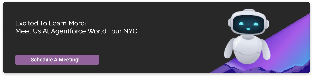 We’re elated to announce that our team of experts is going to be there at the spectacular Agentforce World Tour event in NYC. This event focuses on the upcoming Agentforce AI innovations and offers a full day of sessions, demos, and training. Attendees will have the opportunity to engage with industry leaders, learn about the latest advancements in technologies, and participate in hands-on experiences.